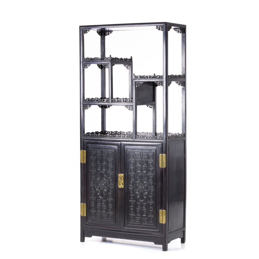 China, Minguo, em tamarindo, decoração entalhada, com duas portas, prateleiras em desnível, ferragens em metal dourado. Sinais de uso. Dim.: 197x40x88 cm.