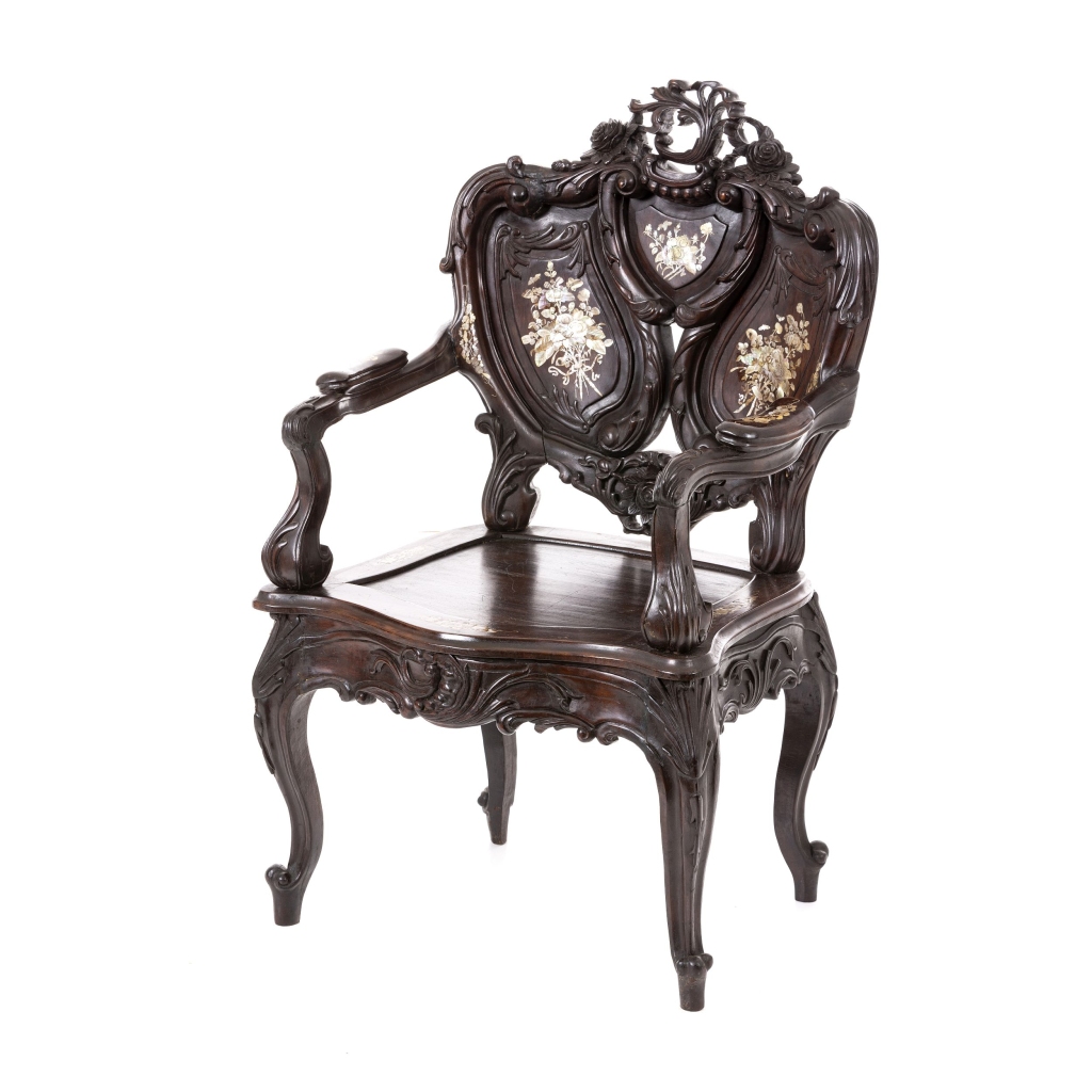 China, República, tamarindo entalhado com embutidos em madrepérola. Sinais de uso. Dim.: 106x66x50 cm.