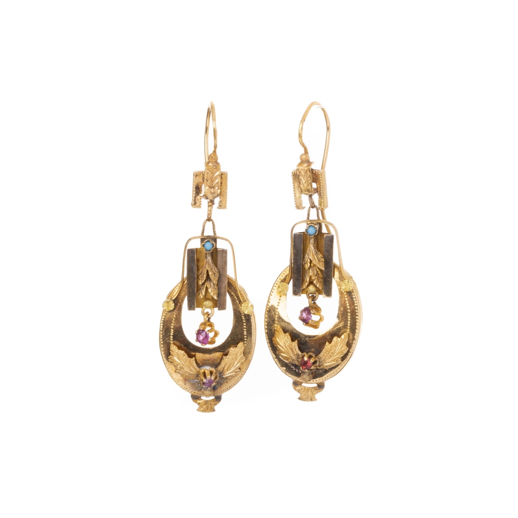 Ouro popular português, marca municipal do Porto, séc.XIX, vazados e relevados com pedraria e turquesa (simile). Sinais de uso, Peso total:7,2g. Dim.:5,5cm.