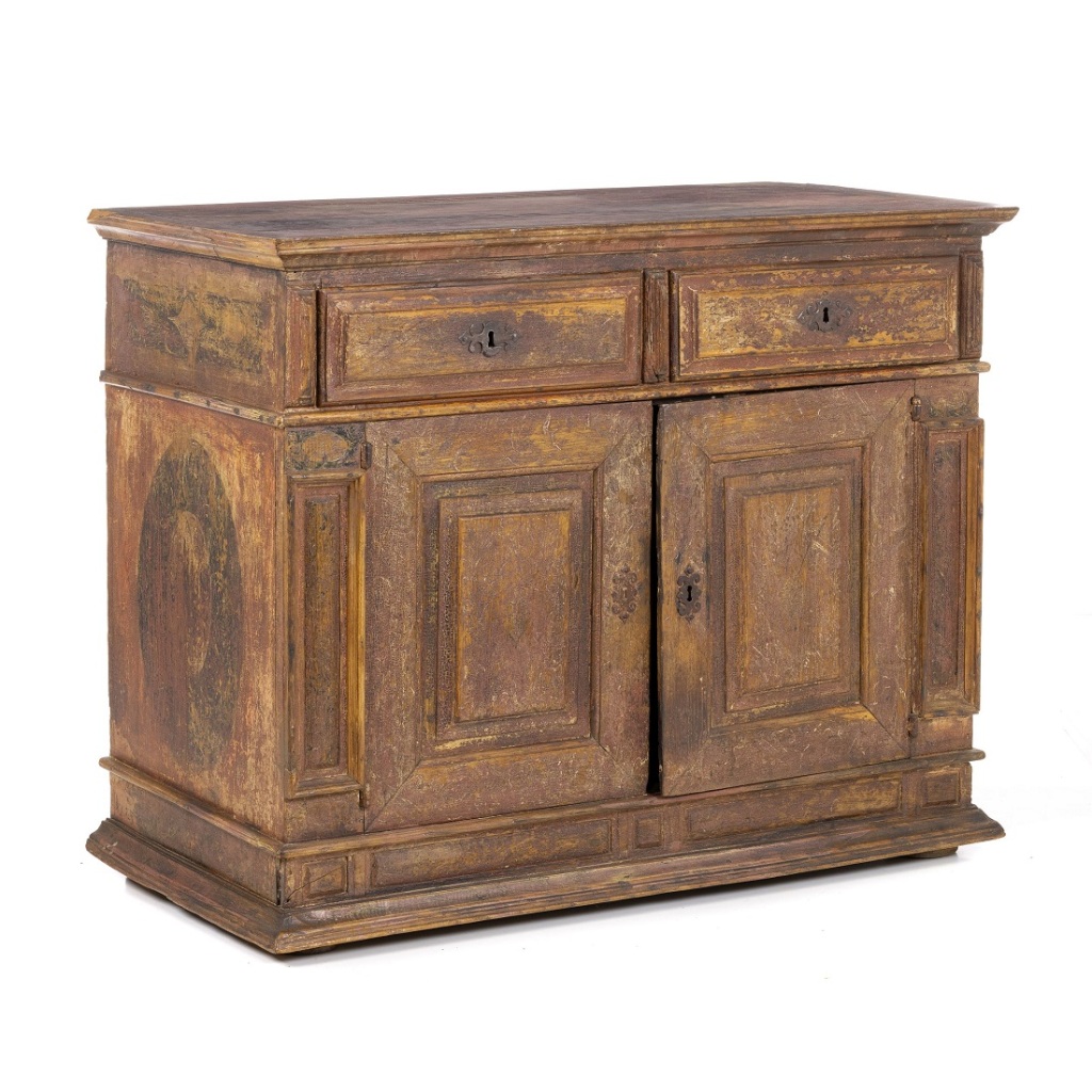 Portugal, séc.XVII/XVIII, em vinhático, duas portas com uma prateleira no interior e duas gavetas, ferragens em metal, vestígios de polícromia e decoração nas laterais. Sinais de uso. Dim.:103x131,5x62,5cm.