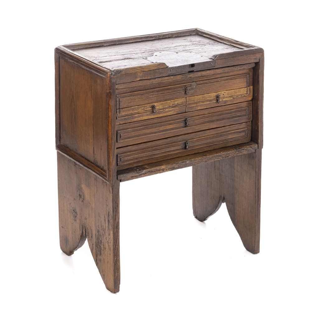 Portuguesa, castanho, séc. XIX com gavetas, chapa e ferragens em metal. Sinais de uso, falta ferro de fecho. Dim.:82x67x44cm.