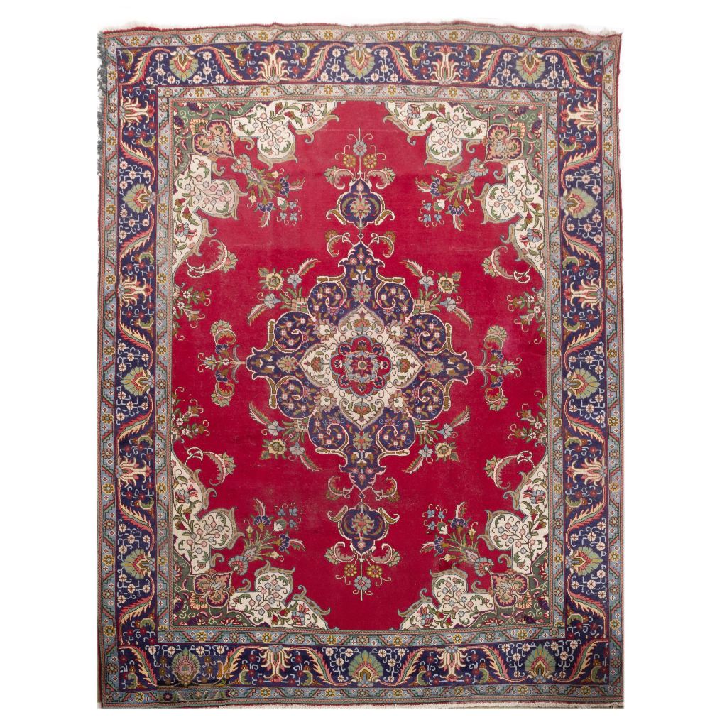 Tabriz, meados séc.XX, fio de lã polícroma de motivos estilizados. Sinais de uso, defeitos. Dim.:388,5x292cm.