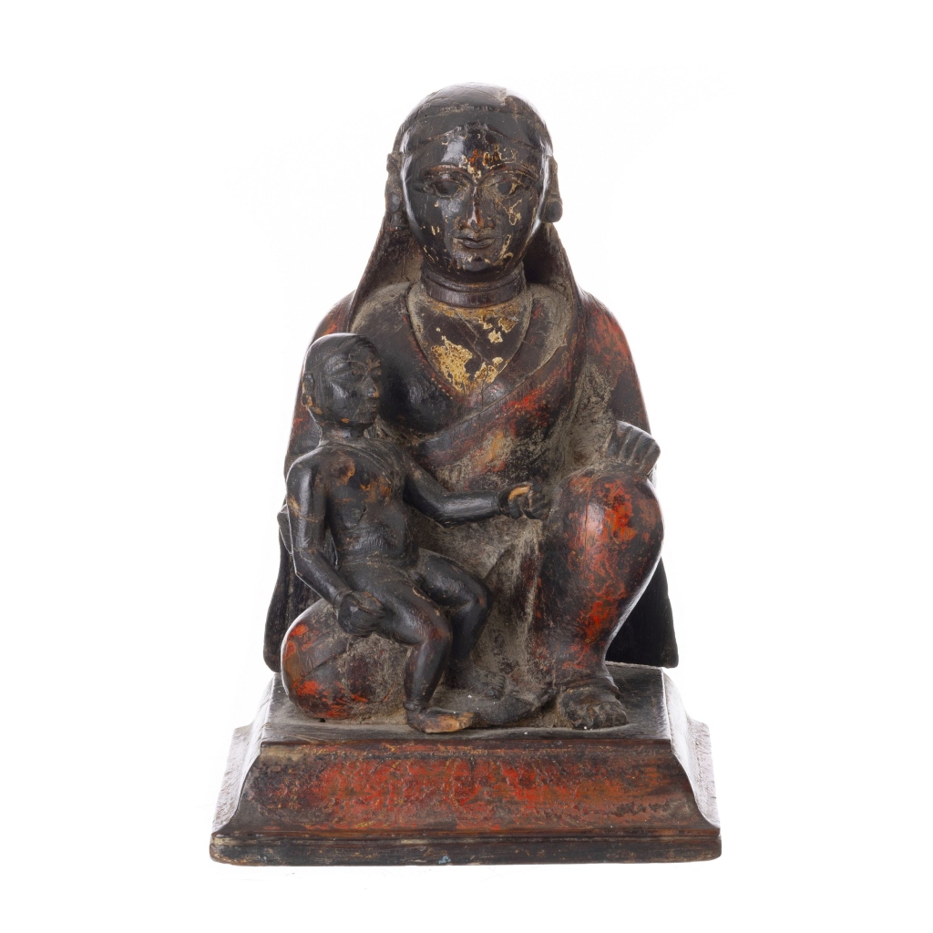India, séc.XVII/XVIII, madeira entalhada e lacada representando Senhora com Menino, vestígios de polícromia e ouro. Sinais de uso. Dim.:21cm.