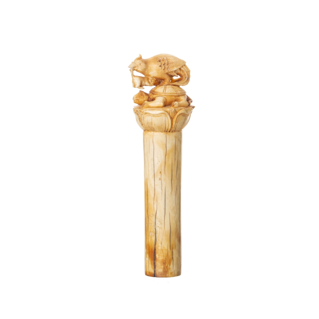 Índia, séc.XIX, cabo em marfim entalhado representando ave, rato e tartaruga. Peso aprox.84,65g. Dim.:13,5cm.
