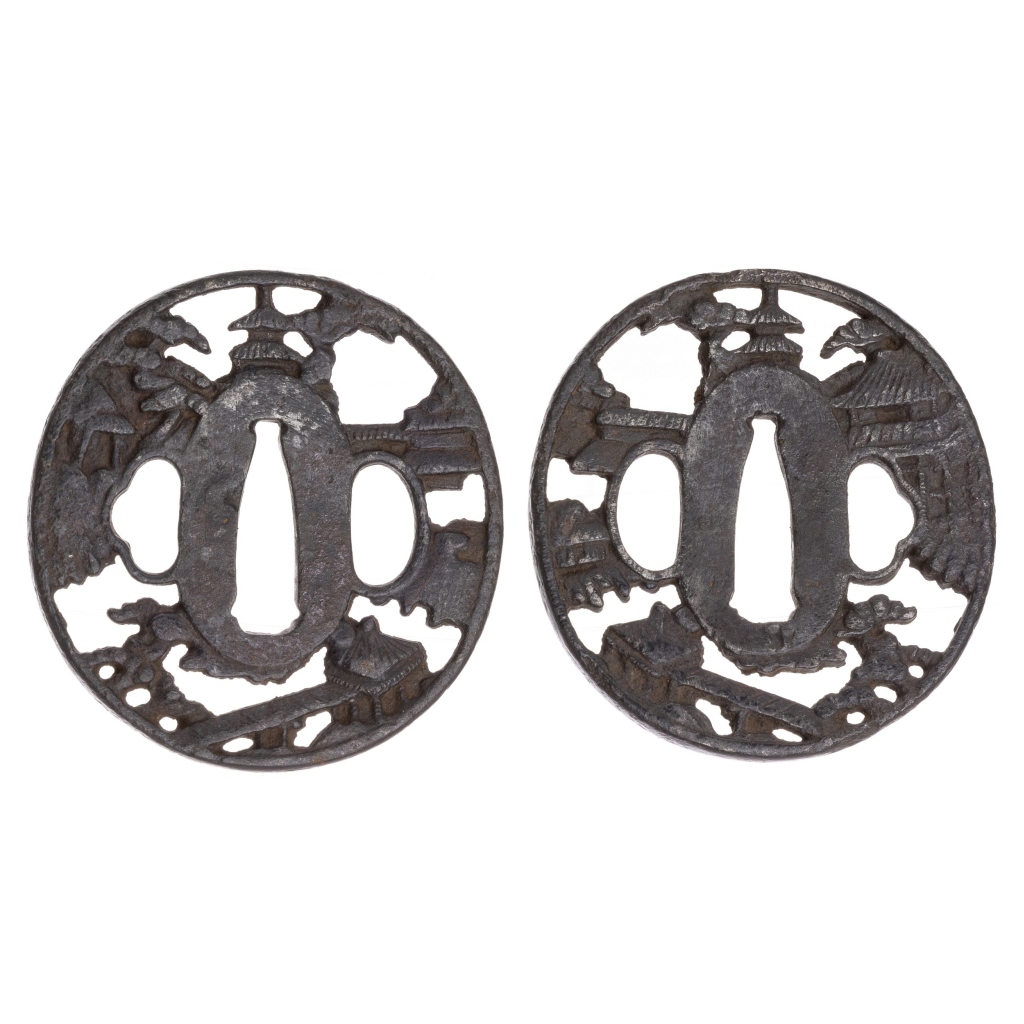 Japão, séc.XVII, período Edo (1615-1868), tsuba sukashi em ferro forjado e vazado, representando paisagem com pagodes. Sinais de uso. Dim.:6,5x6cm.