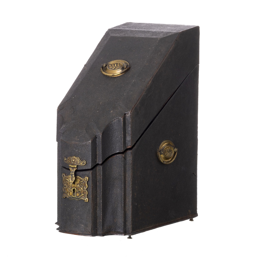 Portuguesa, séc.XVIII, grande estojo de faqueiro em madeira forrada a pele de cação com interior em veludo, ferragens em latão dourado. Sinais de uso. Dim.:34,5 cm