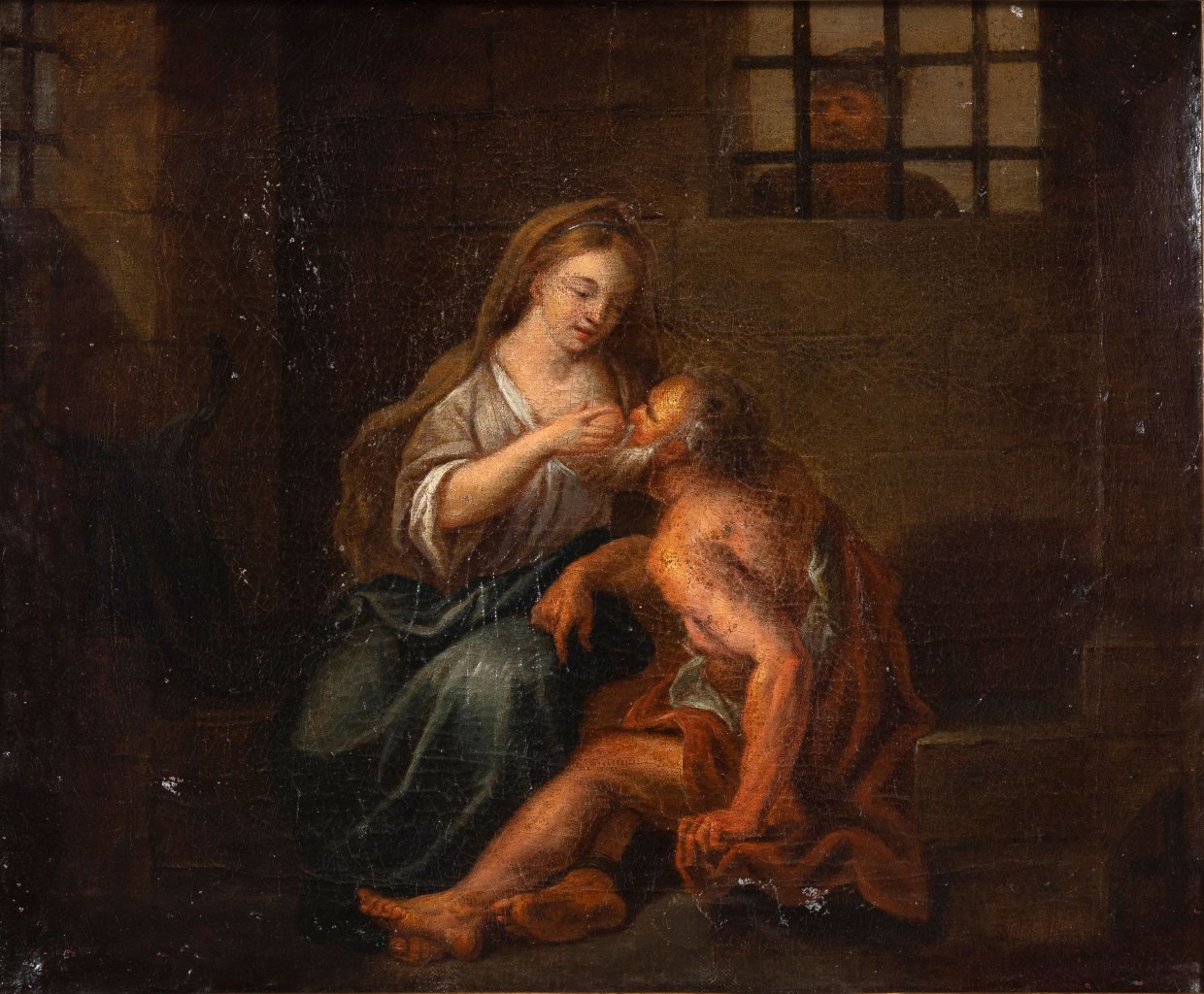 Óleo sobre tela, representando Pero alimentando seu Pai Cimo encarcerado e condenado à morte por fome. Sinais de uso. Dim.:36x44 cm
