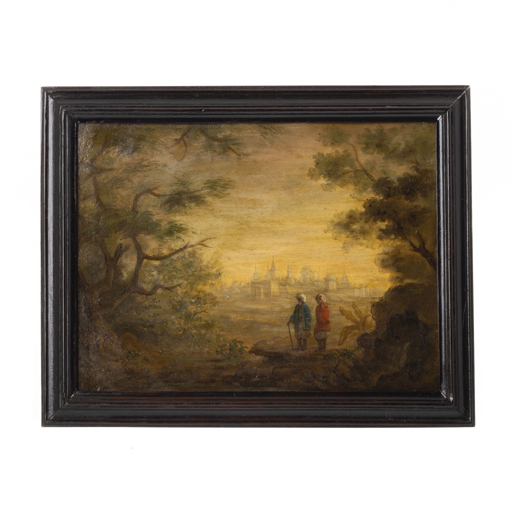 Óleo sobre cobre, possivelmente representando vista de Constantinopla com paisagem e figuras em primeiro plano, emoldurado. Sinais de uso. Dim.18,5:x25 cm