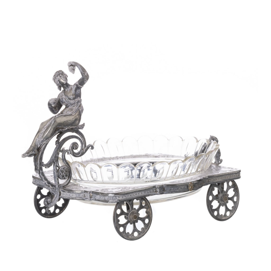 Boémia, séc.XIX, metal estanhado e cristal representando carro com figura feminina no topo, centro em cristal. Sinais de uso. Dim.: 28x42cm
