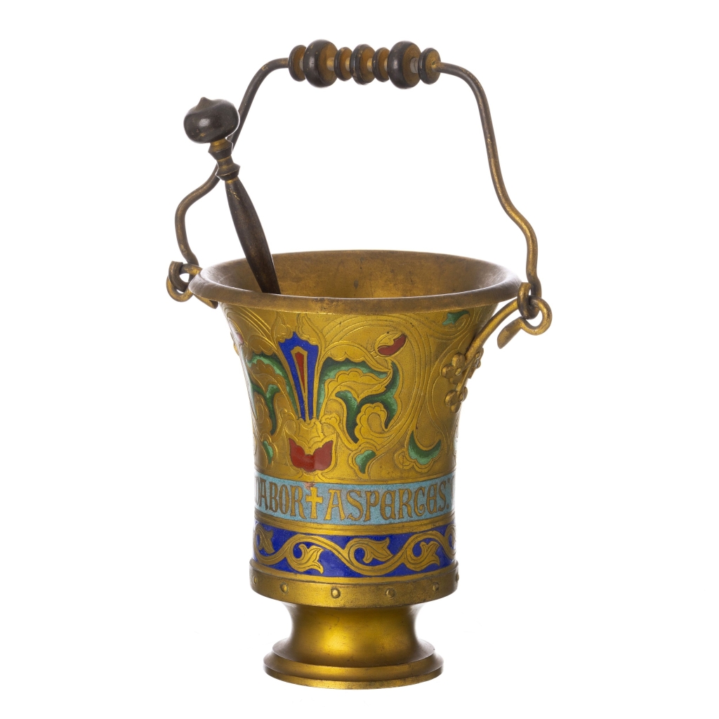 França, séc. XIX, em bronze cloisonné e metal dourado relevado, decoração motivos vegetalistas e inscrição em latim, hissope com crina de cavalo. Dim.:18x20 cm