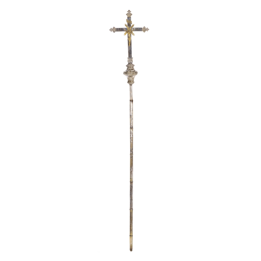 Portuguesa, séc.XVIII/XIX, metal prateado e latão, terminais com decoração relevada com concheados, Cristo relevado em bronze dourado. Sinais de uso. Dim.total:294cm.