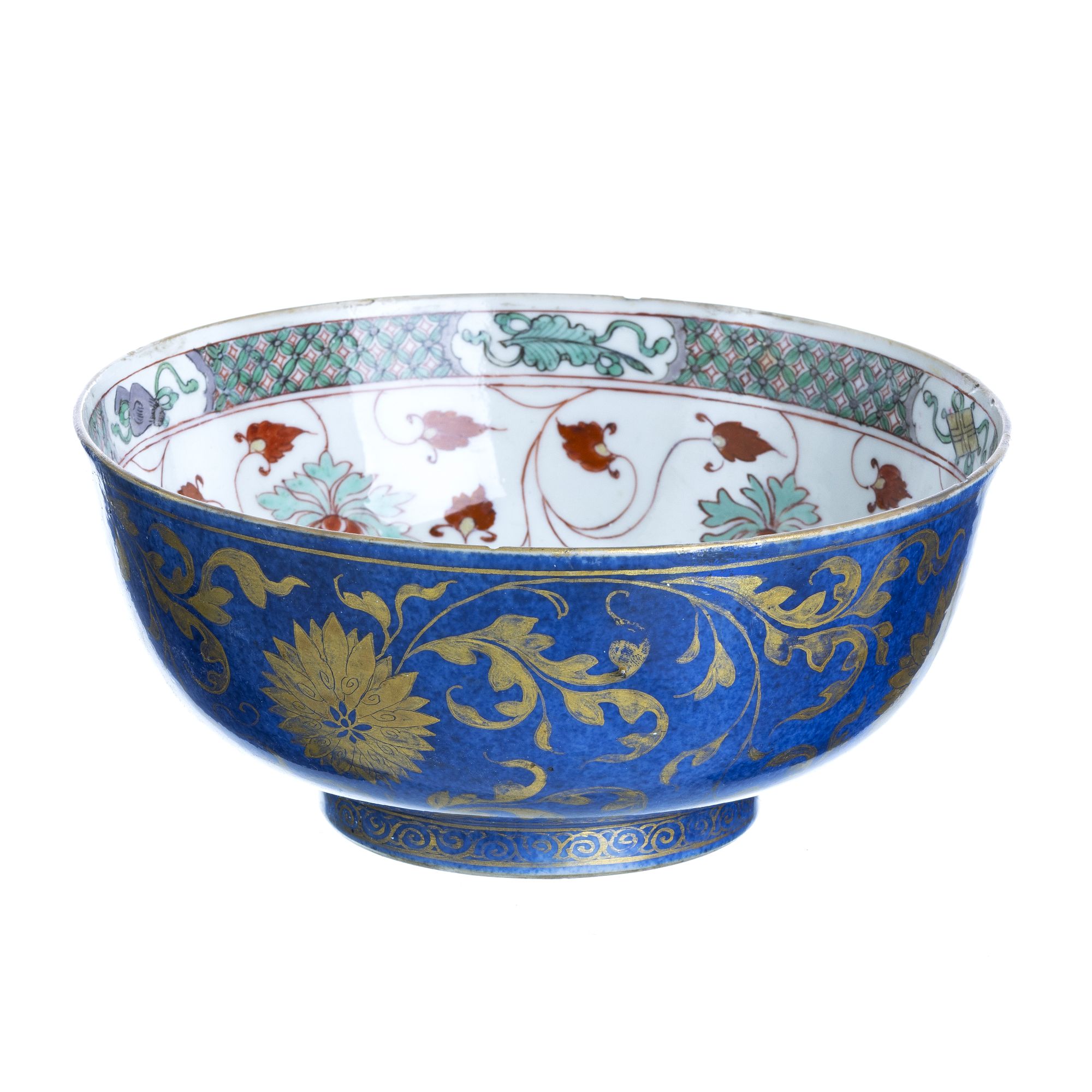 China, Kangxi, decoração vegetalista a ouro sob fundo powder blue, interior com decoração policroma esmalted da familia verde. Restauro. Dim.: 19 cm.