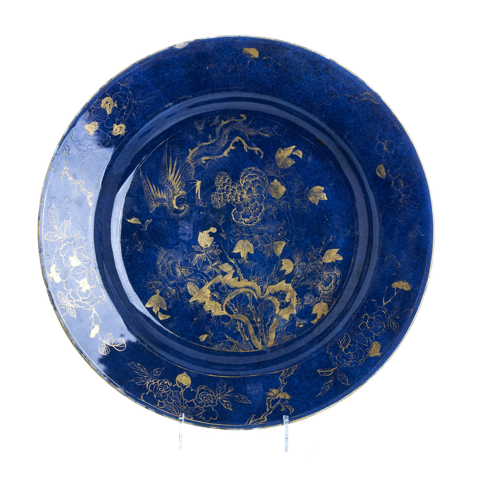 China, Kangxi, decoração a ouro sob fundo powder blue representando fénix entre flores. Desgaste no ouro, pequenos defeitos no bordo. Dim.: 34 cm.
