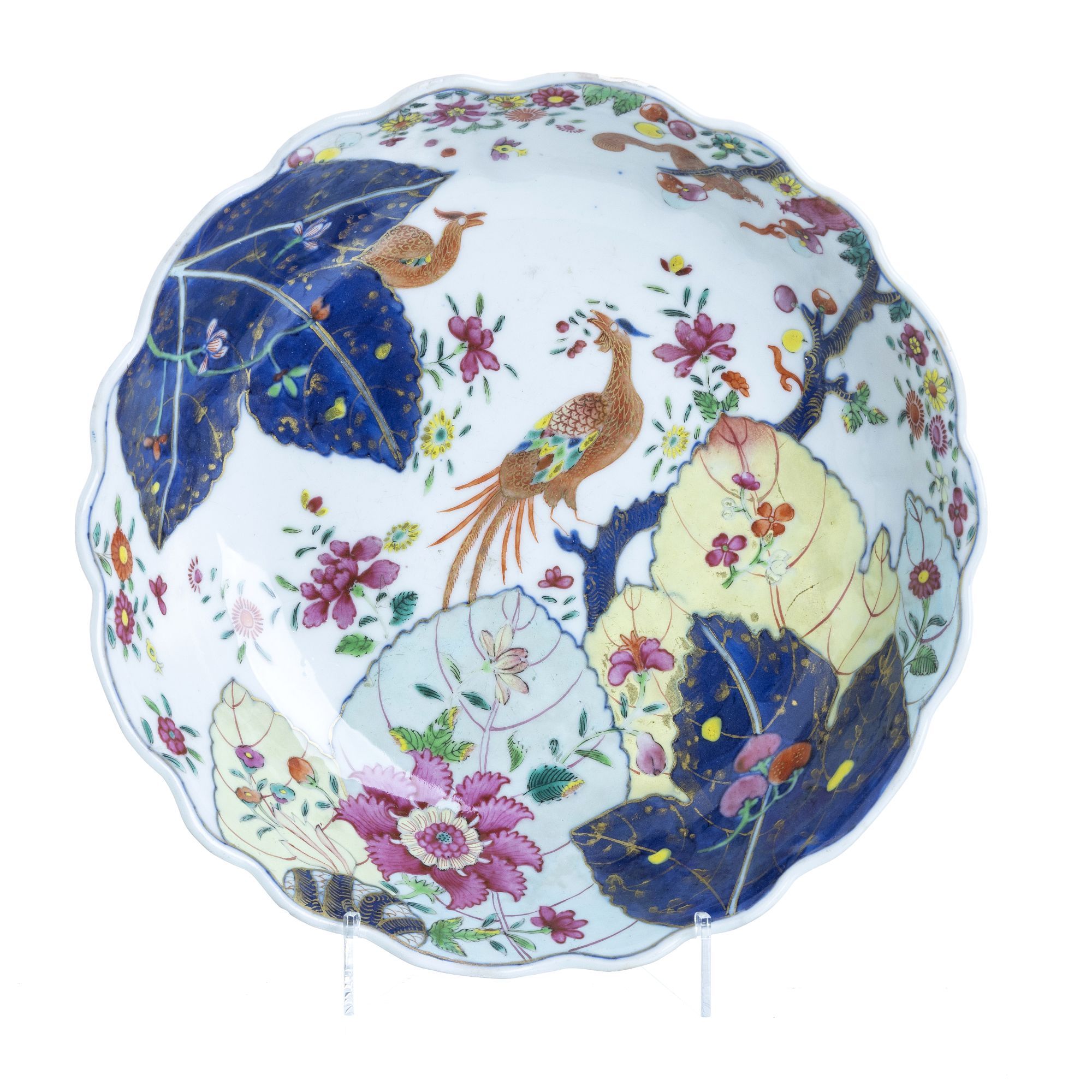 China, período Qianlong, de bordo gomado, decoração policromada a esmaltes da família rosa e a ouro, dita 'folha de tabaco'. Pequeno restauro. Dim.: 23 cm.
