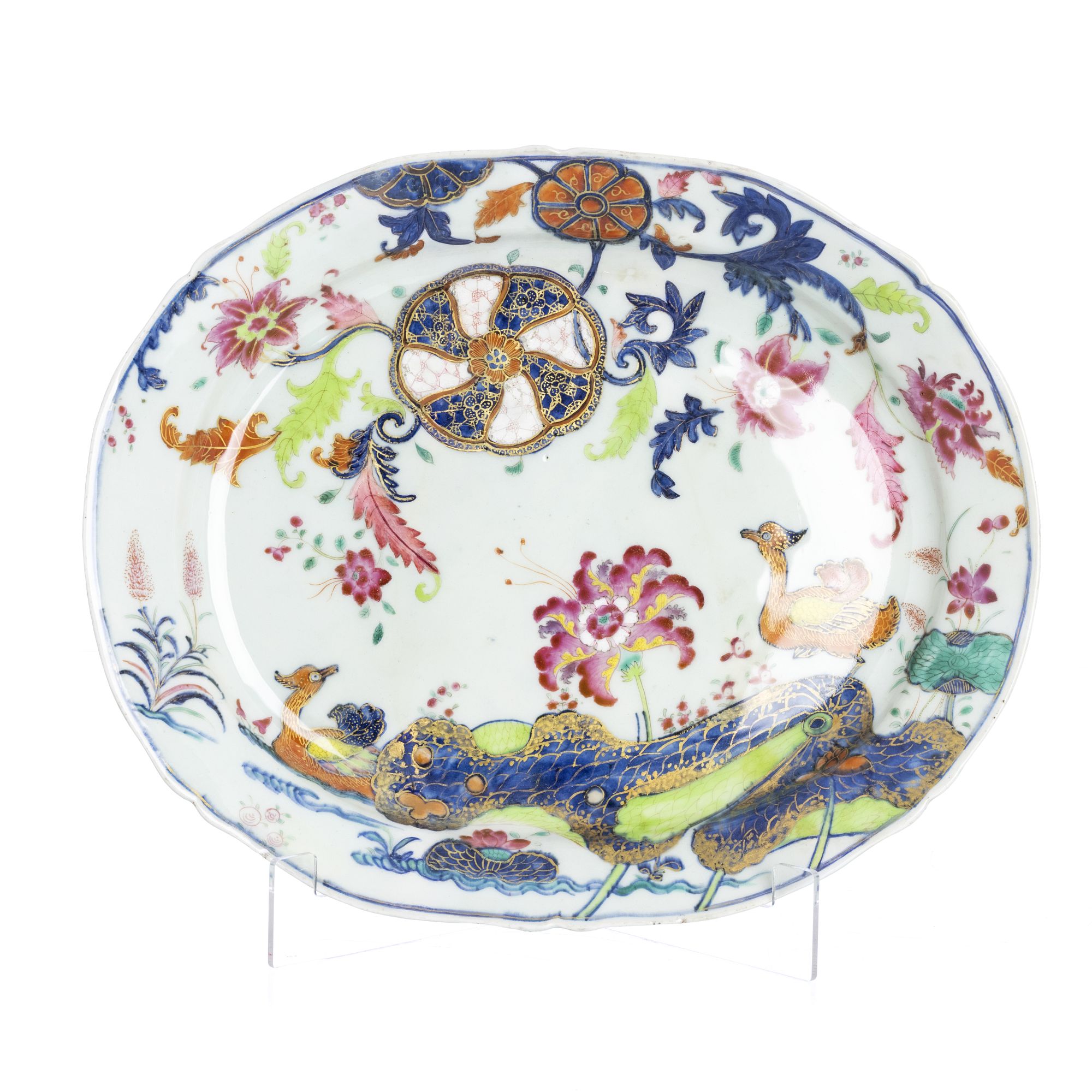 China, período Qianlong, decoração policromada a esmaltes da família rosa e a ouro, com patos mandarins, dita 'pseudo-folha de tabaco'. Restauro. Dim.: 40,5 cm.