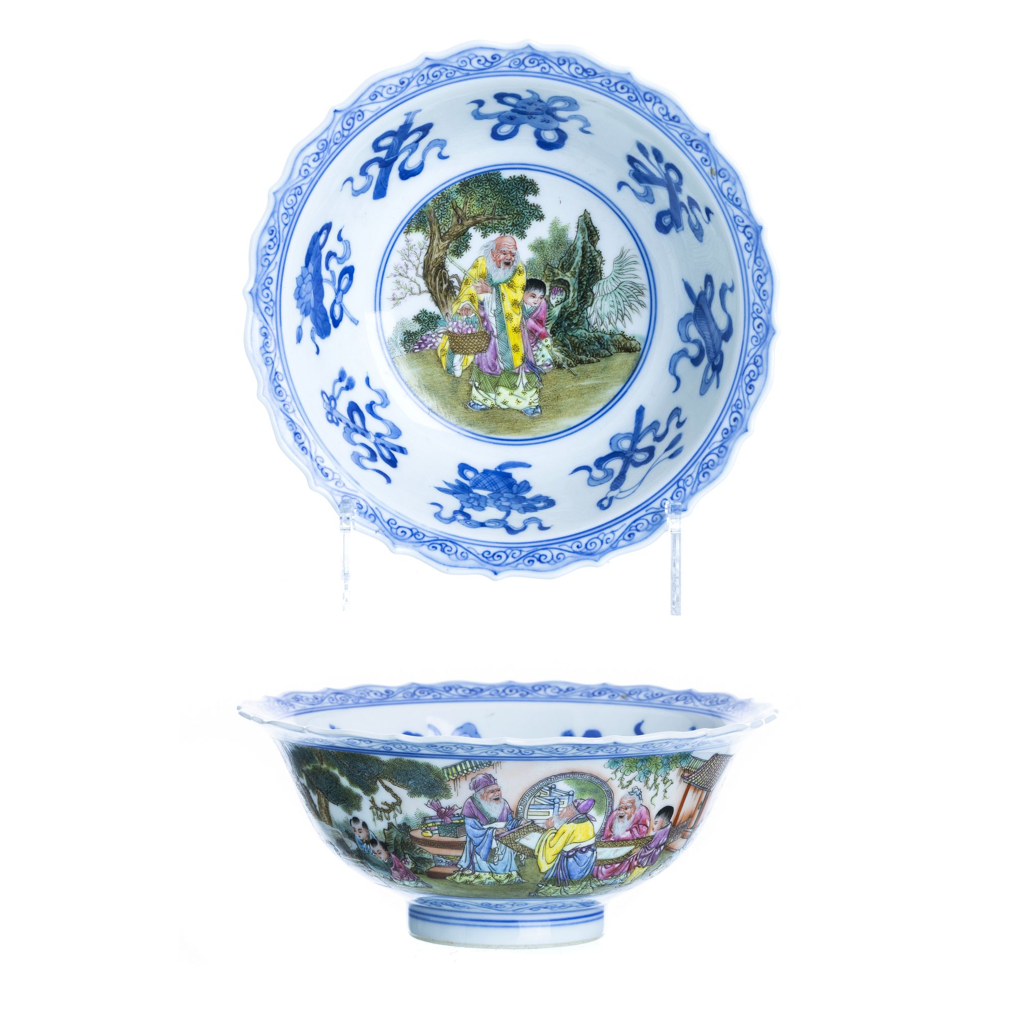 China, séc.XX, decoração no interior e exterior a esmaltes da família rosa com representação de figuras no quotidiano, símbolos ta+istas no interior. Dim.:15 cm