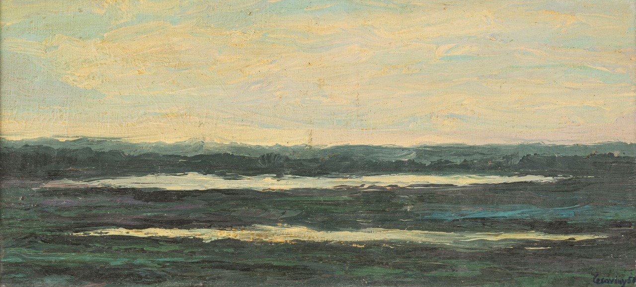 Óleo sobre platéx, assinado e datado 58. Adjunta-se Certificado de Prof. Bernardo Pinto de Almeida. Sinais de uso. . Dim.:24x51,5 cm