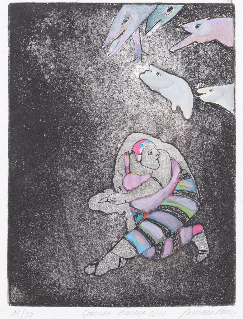Gravura intervencionada, pintada a óleo, assinada e numerada de 15/30, adjunta-se certificado. Sinais de uso. Dim.:17x23 cm