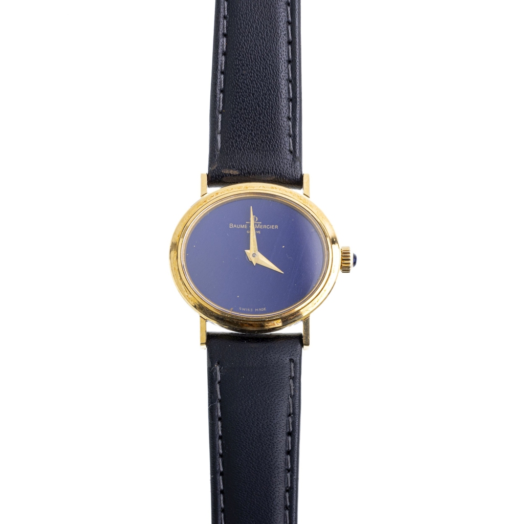 Caixa em ouro 750, Helvetia, movimento mecânico de corda manual, ref. 637701 38235 2, mostrador em lápis lazúli, coroa com safira cabochão, bracelete substituída, com estojo. Marcado. Sinais de uso. Dim.mostrador:2,3x2,7cm.