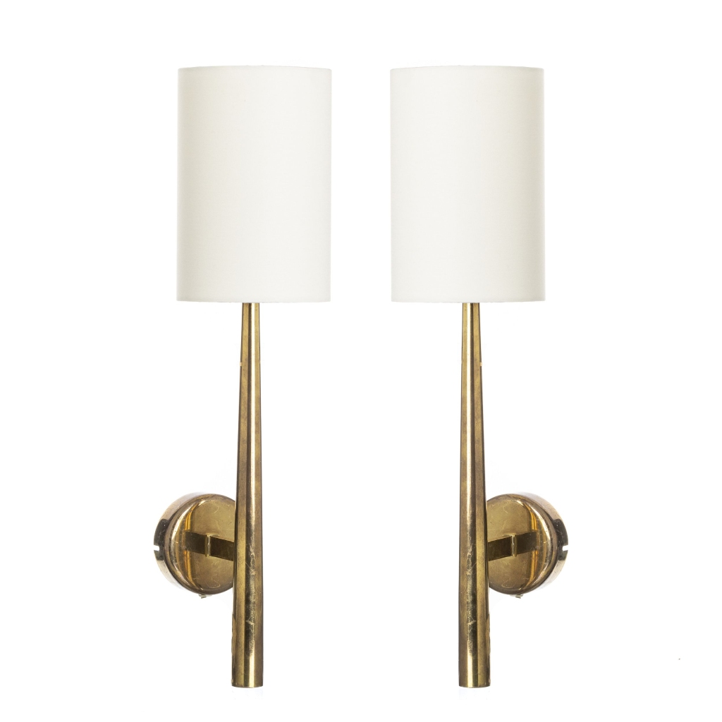 Escandinávia, c.1970, par de apliques estilizados em latão dourado, abatjours em tecido. Sinais de uso. Dim.: 48x13cm