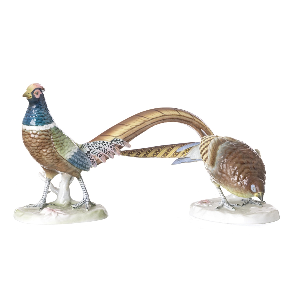 Esculturas em porcelana da Vista Alegre, decoração polícroma com representação de faisões macho e fêmea. Marca 1968-1971, 1974 Sinais de uso. Dim.:37 e 38,5 cm