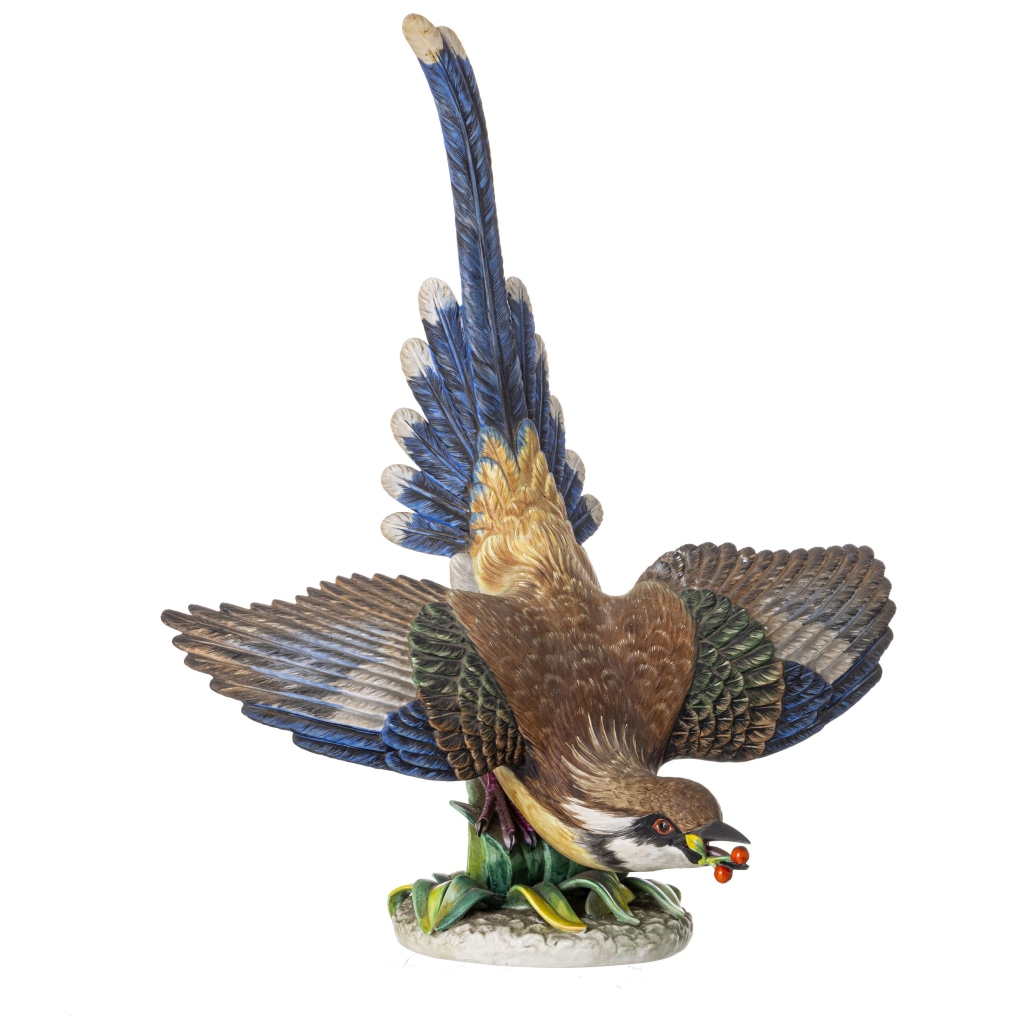 Escultura em biscuit moldado e relevado com decoração polícroma pintao à mão. Marca 1971-1980. Pequeno restauro na cauda e no bico. Dim.:38,5 cm