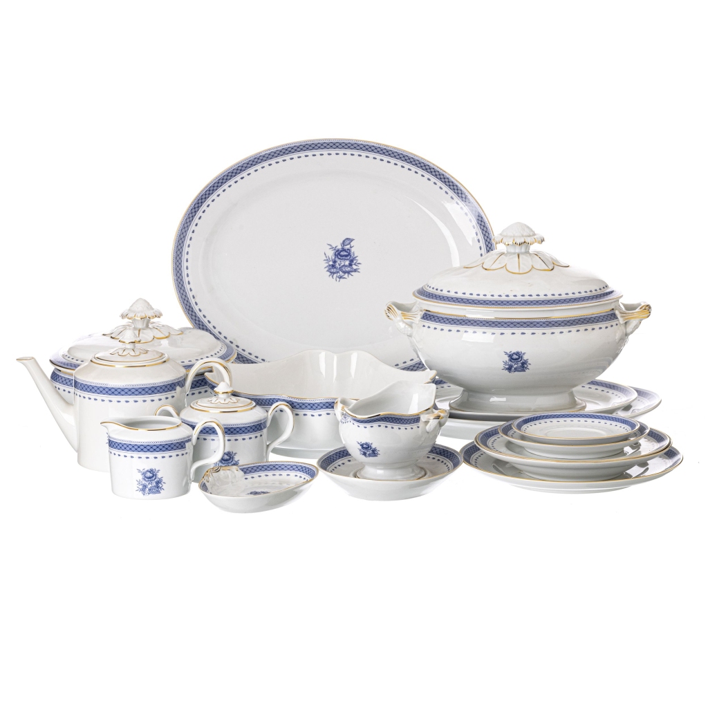 Serviço de jantar completo para 12 pessoas em porcelana da vista alegre moldada policroma a azul e ouro, coleccção 'Cozinha Velha'. Marca 1971-1980. Dim.: 7,5 a 41 cm