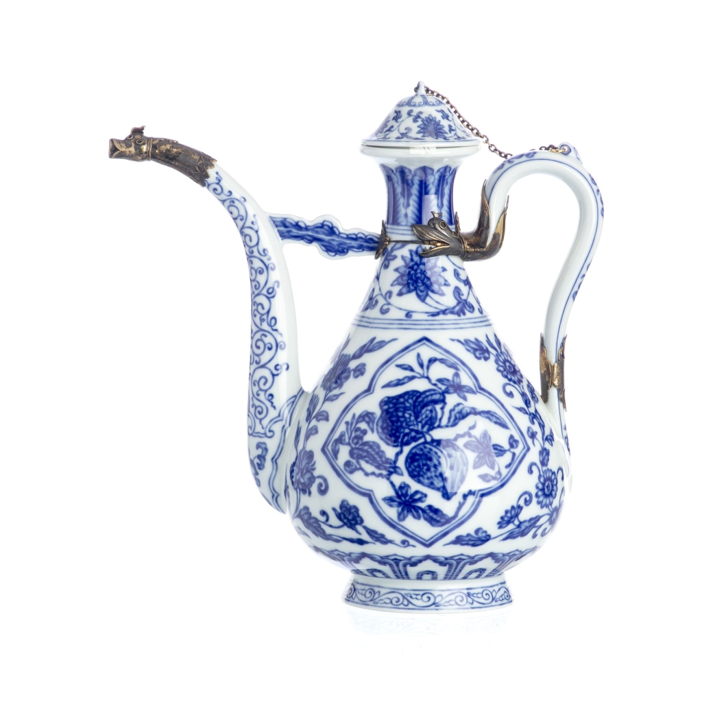 Porcelana moldada da Vista Alegre, decoração a azul e branco. Reprodução de uma peça da Dinastia Ming, séc. XV. Edição especial limitada a 250 exemplares, numerada 033, datada de 2000. Aplicação em prata, contraste águia 925 (após 1985). Dim.: 31 cm.