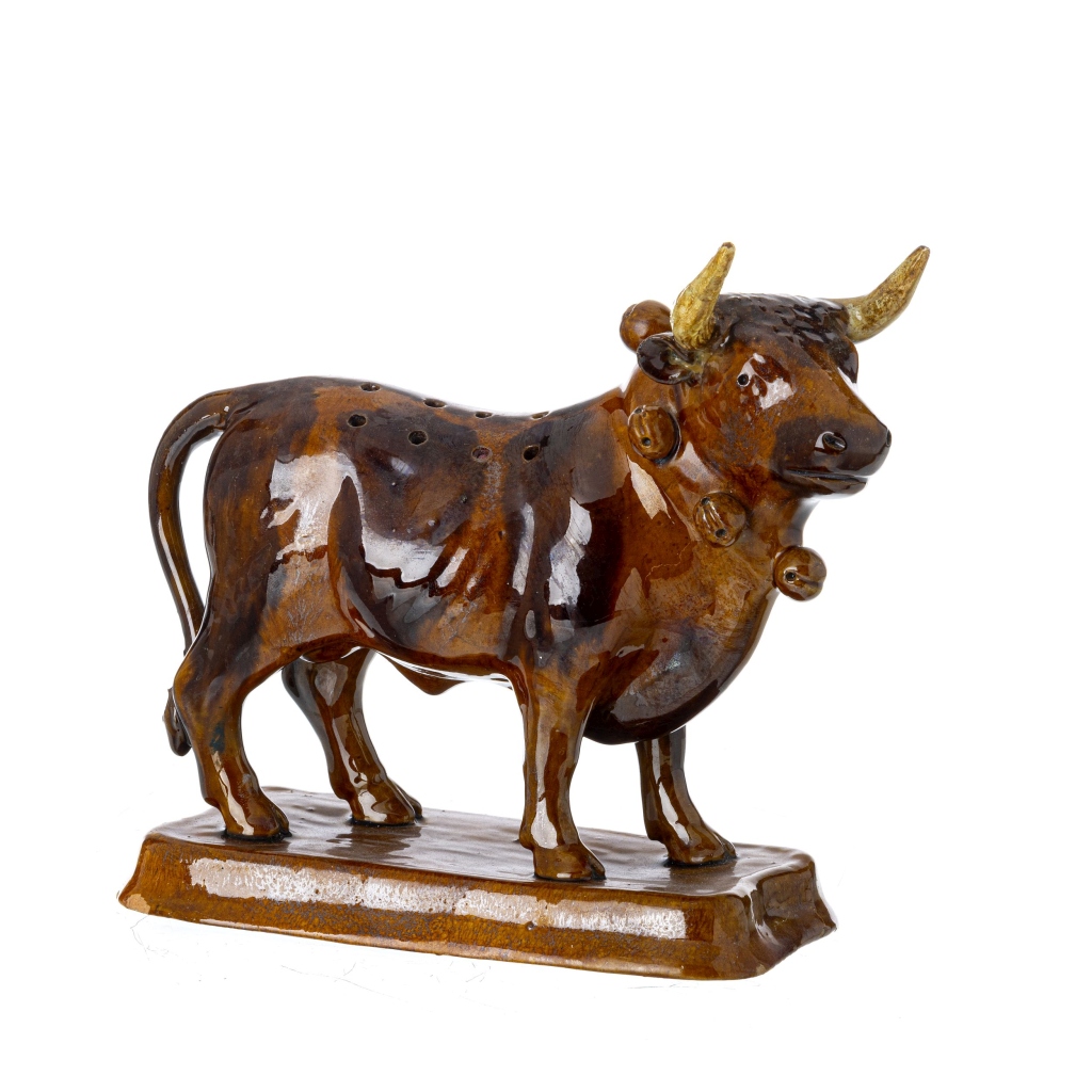 Faiança das Caldas da Rainha, fabrico de Herculano Elias, decoração polícroma vidrada representando touro. Marca na base. Sinais de uso. Dim.:18,5cm.