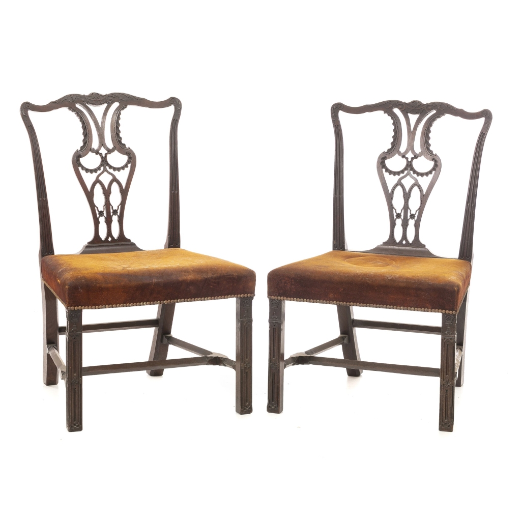 Inglesas, séc.XVIII, em mogno entalhado com motivos vegetalistas, assentos estofados a couro. Sinais de uso. Dim.: 95x52x60 cm.