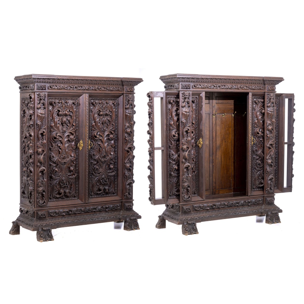 Portugal, séc.XIX em castanho ricamente entalhado e vazado, decoração vegetalista e figurativa com mascarões, pés figurativos, duas portas de correr com bengaleiro no interior, ferragens em metal dourado. Sinais de uso. Dim.:190x156x60 cm