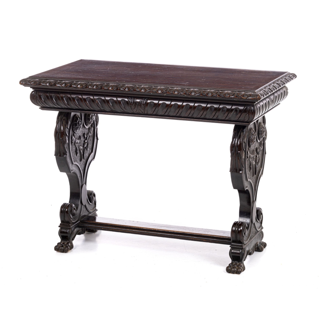 Portugal, séc. XIX/XX em castanho entalhado com motivos florais e vegetalistas com florões, pés de garra. Sinais de uso. Dim.: 72x95x55