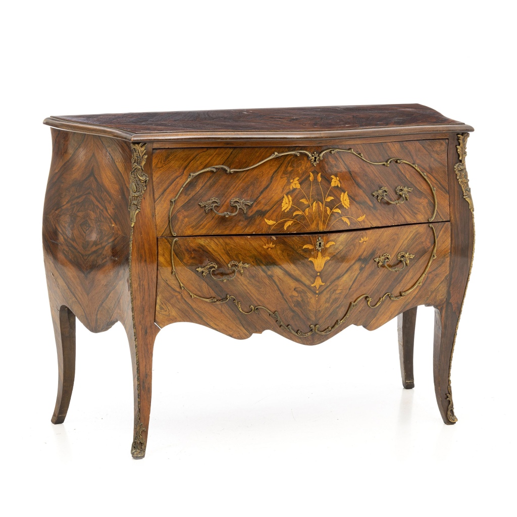 Portugal, séc.XX, marchetaria em mogno e outras madeiras, com duas gavetas decoradas com motivos vegetalistas, ferragens em bronze. Sinais de uso, pequenos defeitos. Dim.:85x115,5x52 cm