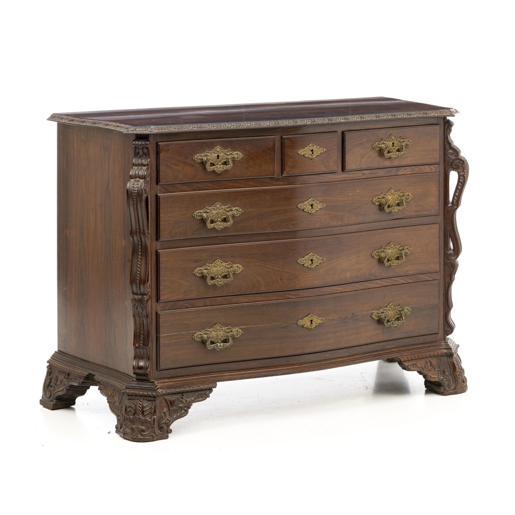 Portugal, séc.XX, estilo D.José, pau-santo entalhado, com três gavetas e três gavetões, ferragens em metal. Sinais de uso. Dim.:92x126x56 cm