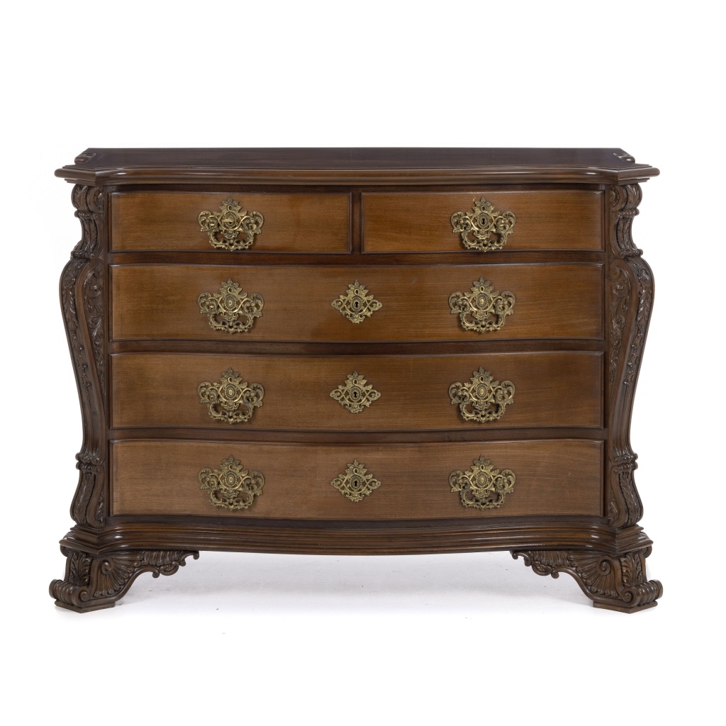 Portugal, séc.XX, em mogno entalhado com duas gavetas e dois gavetões, com ferragens em metal dourado. Dim.:100x135x58,5cm.