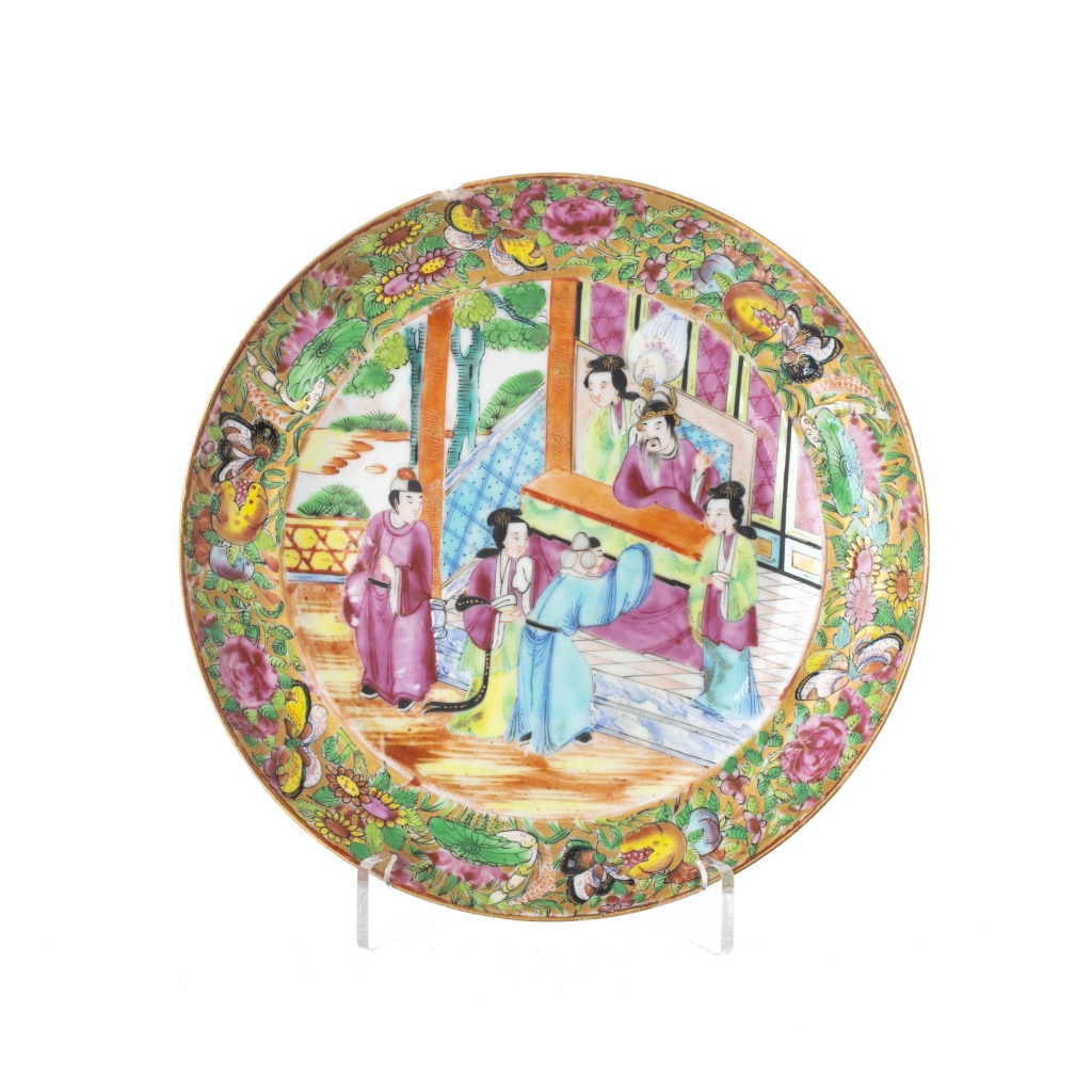 China, Daoguang, decoração polícroma a esmaltes e a ouro, de figuras da corte, aba de flores, borboletas e frutos. Sinais de uso, esbeiçadela no bordo. Dim.:20,5 cm