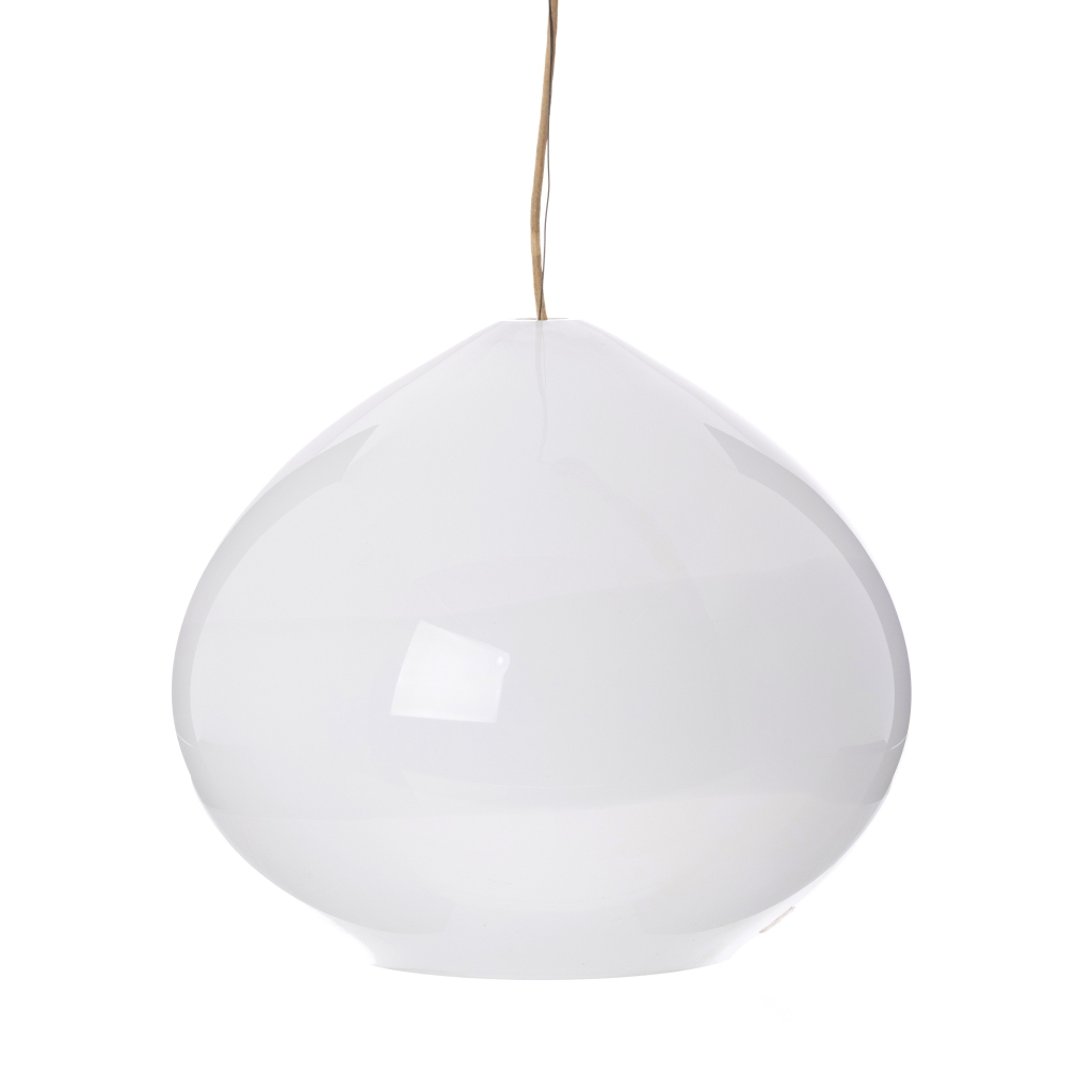 Itália, c.1960, candeeiro de tecto em vidro branco de Murano, design por Alessandro Pianon para Vistosi. Dupla camada em vidro opalino branco, ajustável por fio de aço, aplique em metal. Dim.: 41 cm