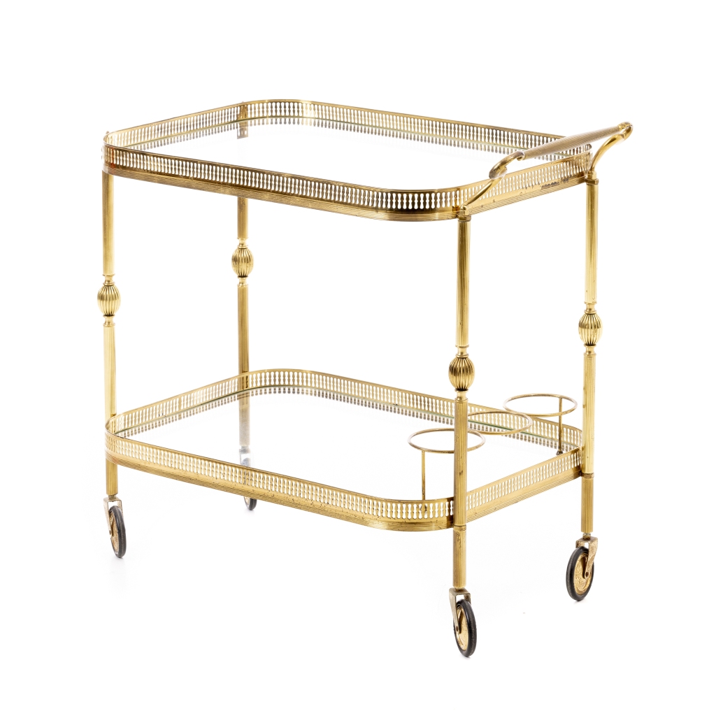 Metal dourado, com pés de rodízio, três suportes para garrafas e com prateleiras em vidro. Sinais de uso. Dim.:65x75x44cm.