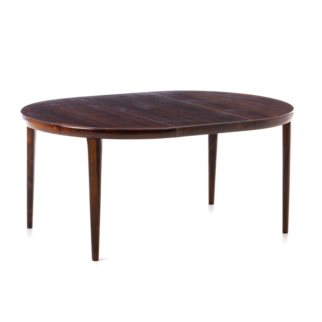 Dinamarca, c.1960, pau-santo e outras madeiras de bordo boleado, com uma tábua de acrescento. Sinais de uso. Dim.: aberta.:58x90x90cm ; Dim fechada.:58x130x90cm.