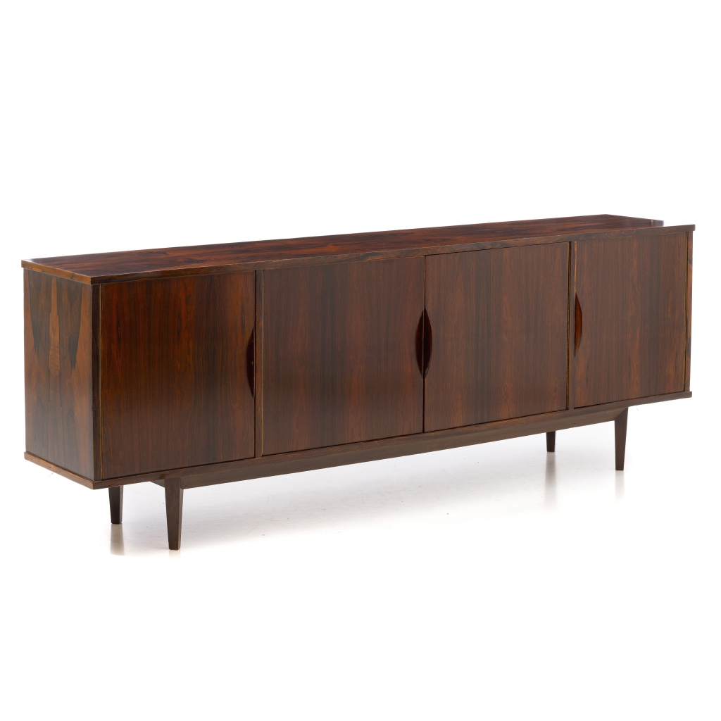 Dinamarca, c.1960/70, aparador de quatro portas folheado a pau santo,com oito gavetas interiores e prateleira. Dim.:221x45x81cm.