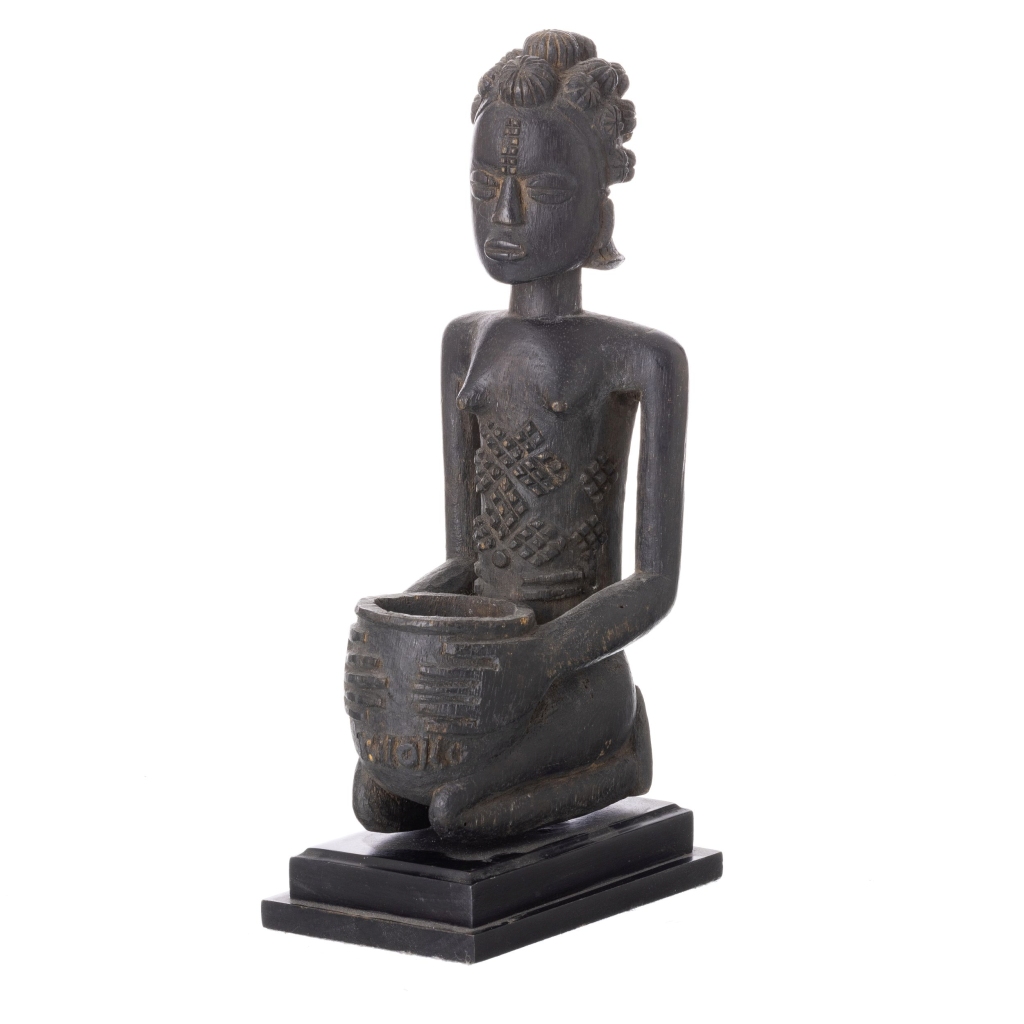 Kongo, séc.XX, primeira metade,escultura em madeira escurecida representando figura feminina com escarificações segurando taça ritual. Patine de uso. Ex: H.Guidemont; Jean Marc Desaive, Bélgica. Dim.:29x9x14,5 cm