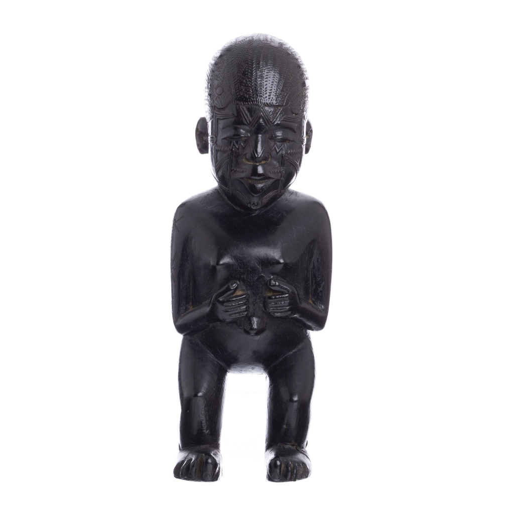Moçambique séc. XX, segundo quartel, escultura em ébano com decoração relevada e incisa com figura grávida. Sinais de uso, partido e colado nos pés. Dim.:26 cm