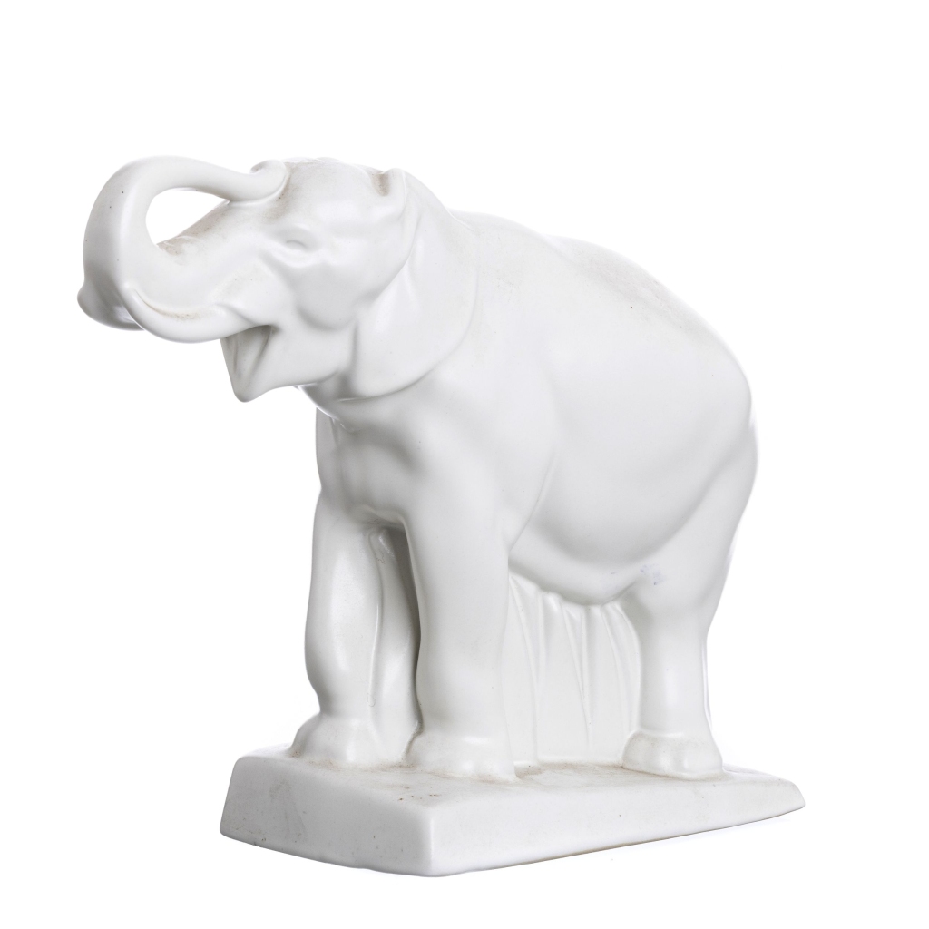Escultura de elefante em cerâmica de Sacavém, decoração monócroma a branco. Marcada na base. Dim.:29 cm