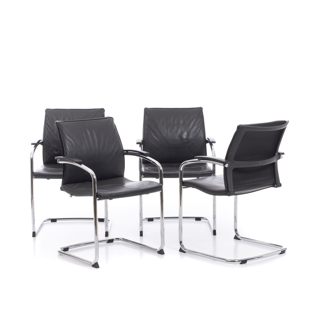 Alemanha, c. 1980, quatro cadeiras de braços com estrutural tubular em metal cromado, estofo em pele preta. Marcada Sedus. Sinais de uso. Dim: 68cm x 63cm x 86cm