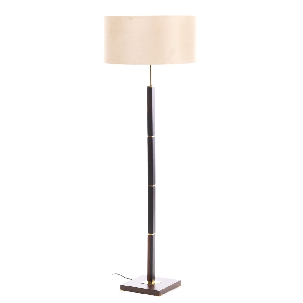 Contemporâneo, base e fuste em pau-santo com aplicações em metal dourado, abat-jour bege em veludo. Electrificado. Dim.total:164cm