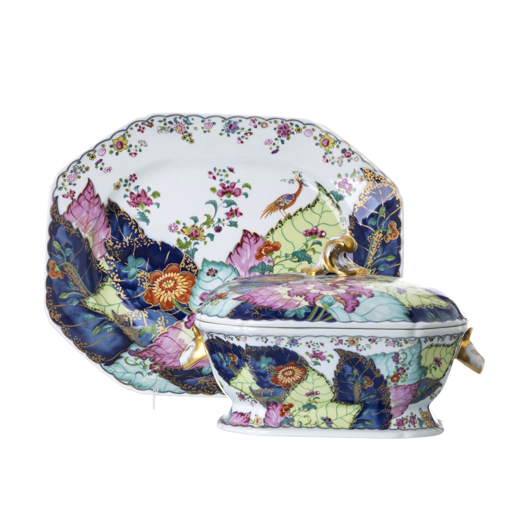 Porcelana moldada da Vista Alegre, com decoração 'folha de tabaco' polícroma e a ouro. Ed. Mottahedeh, Metropolitan Museum of Art. Marca 1980-1992. Dim.: 43,5 e 37 cm.