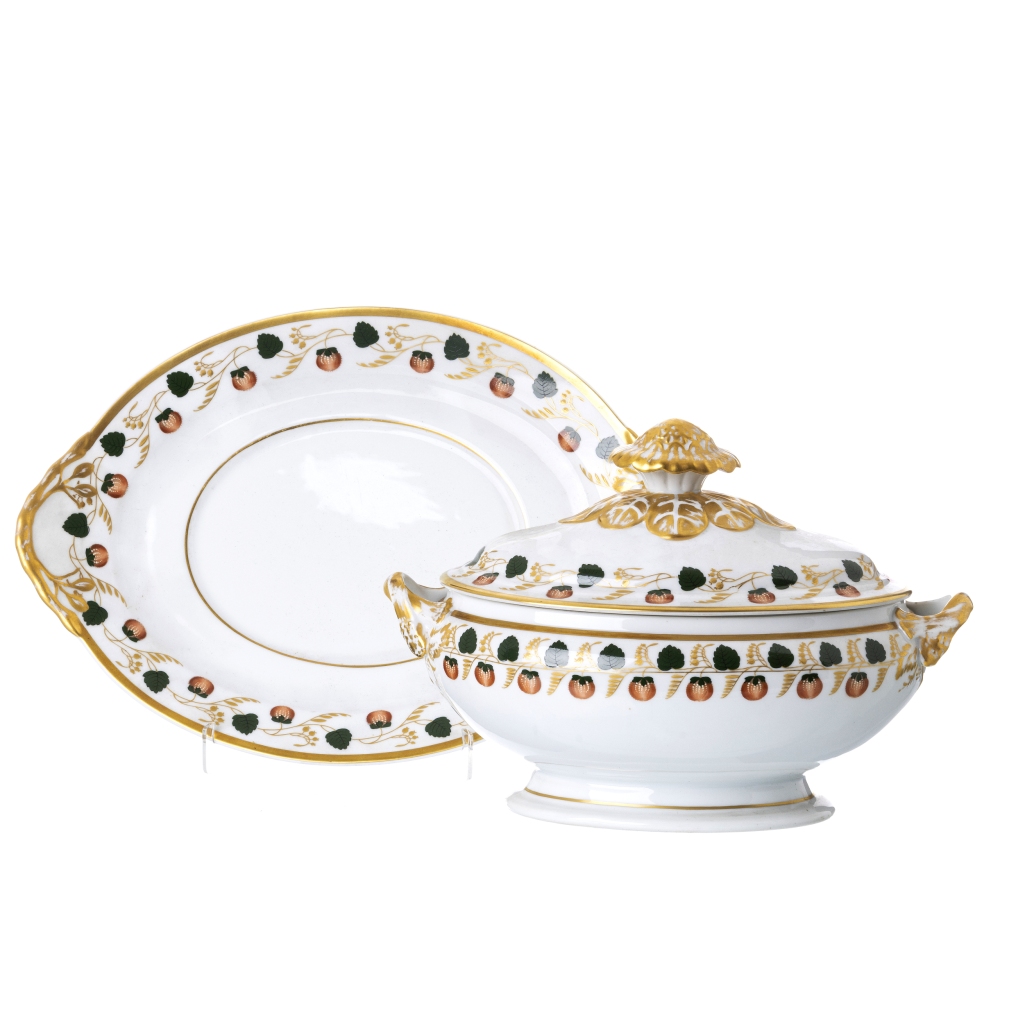 Porcelana moldada da Vista Alegre com decoração polícroma e ouro com morangos, colec. Strawberry Vine. Marca 1980-1992. Sinais de uso. Dim.:27,5 e 32,5 cm