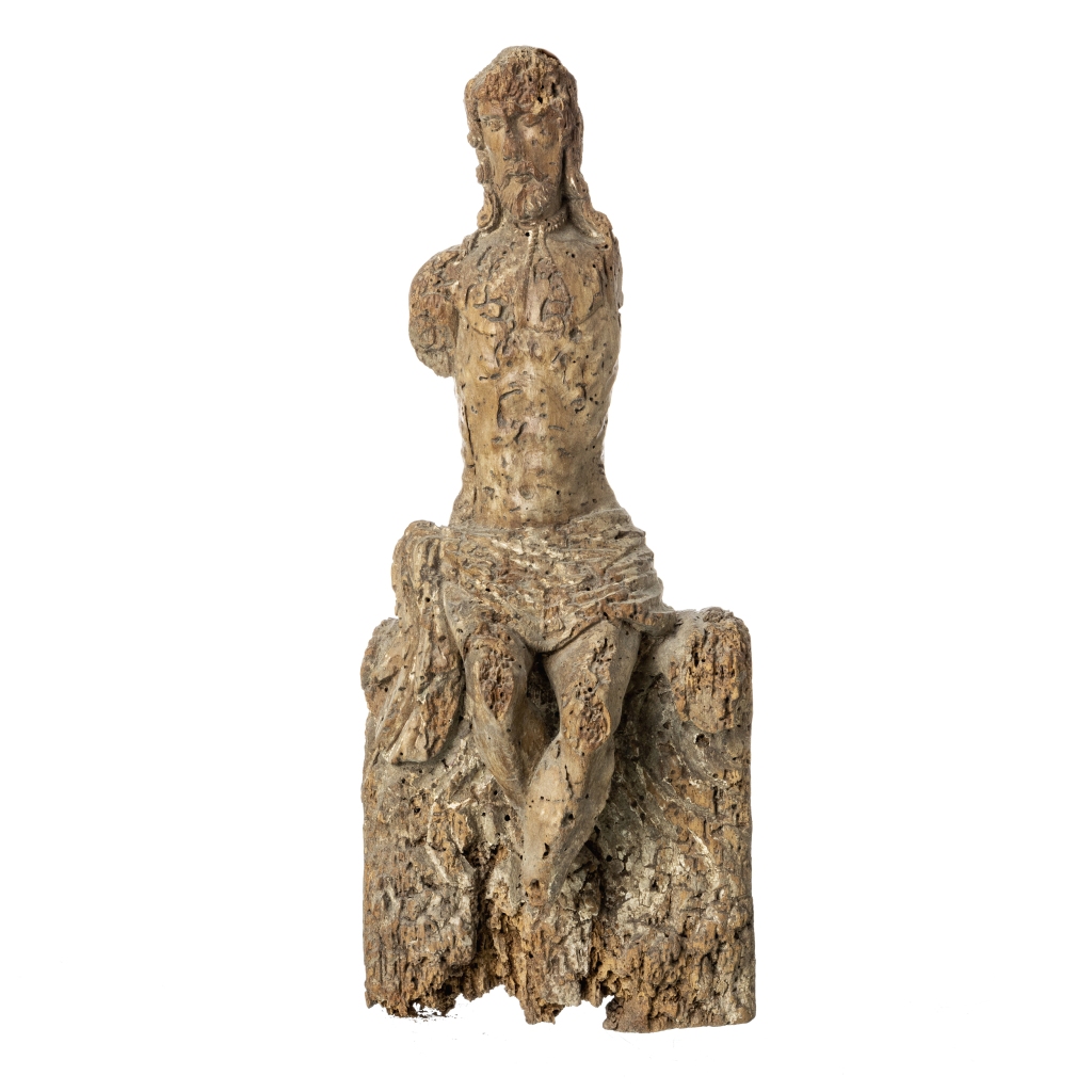 Portugal, séc. XV, escultura em madeira entalhada com representação de Cristo de mãos atadas. Faltas e defeitos, vestígios de xilófagos. Dim:42cm