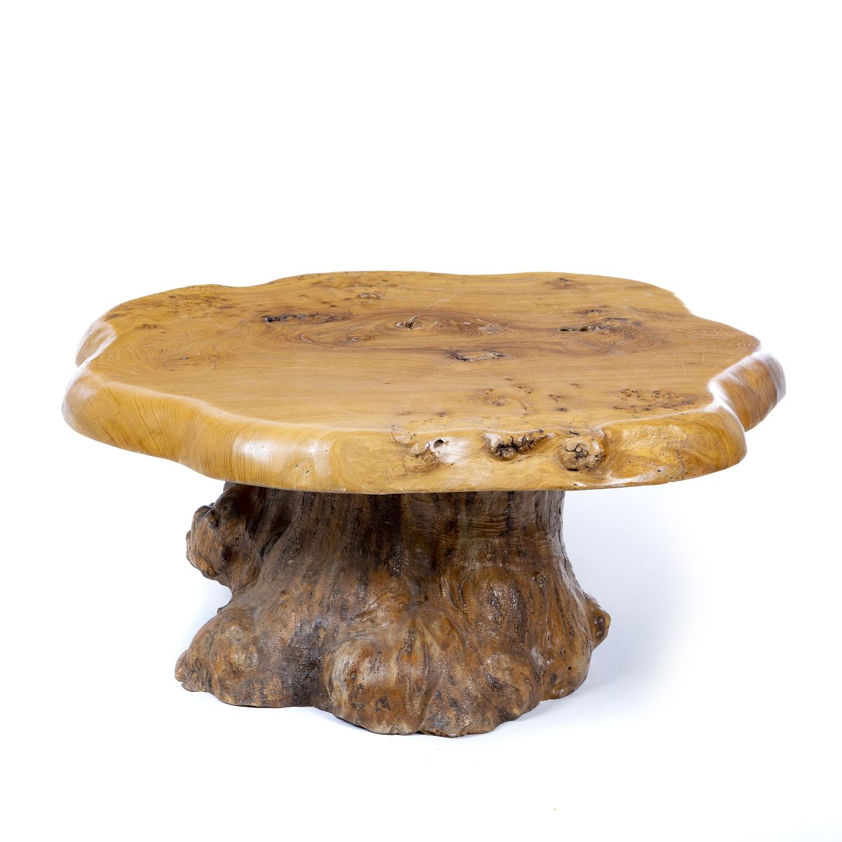 França, c.1970, estrutura e tampo em troncos de madeira e raiz de nogueira. Dim.: 46x100x86 cm.