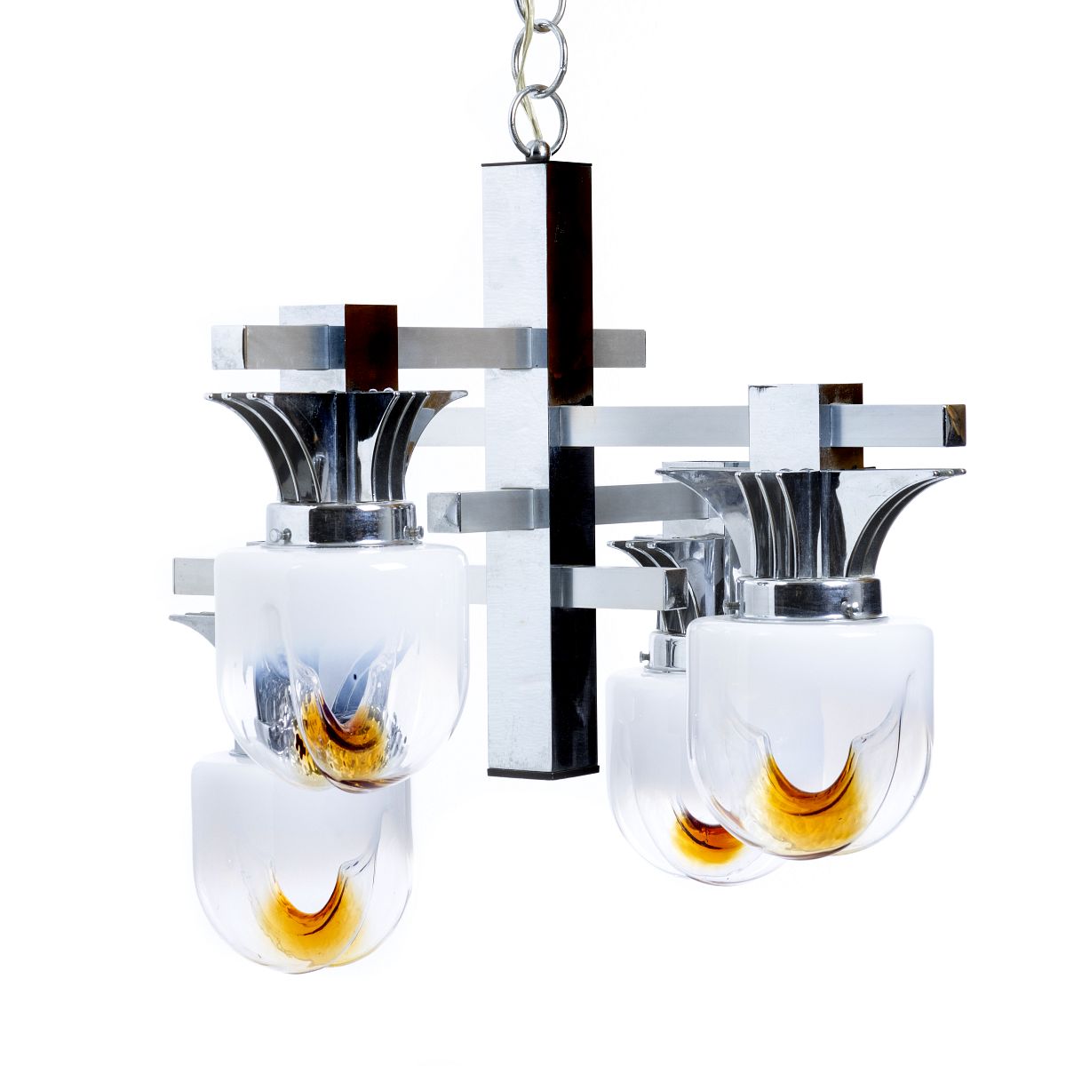 Itália, c.1970, fabrico de Mazzega, em metal cromado, globos em vidro opalescente de Murano. Electrificado. Sinais de uso. Dim.: 63 cm.